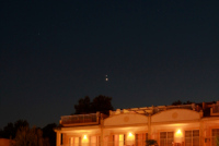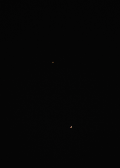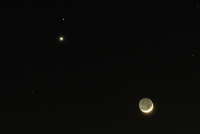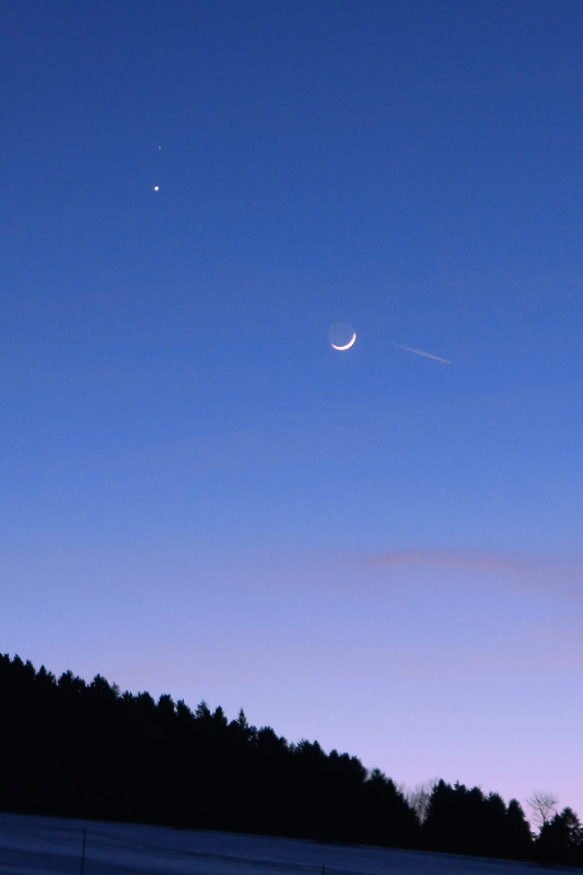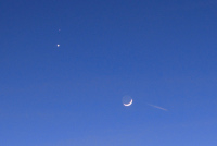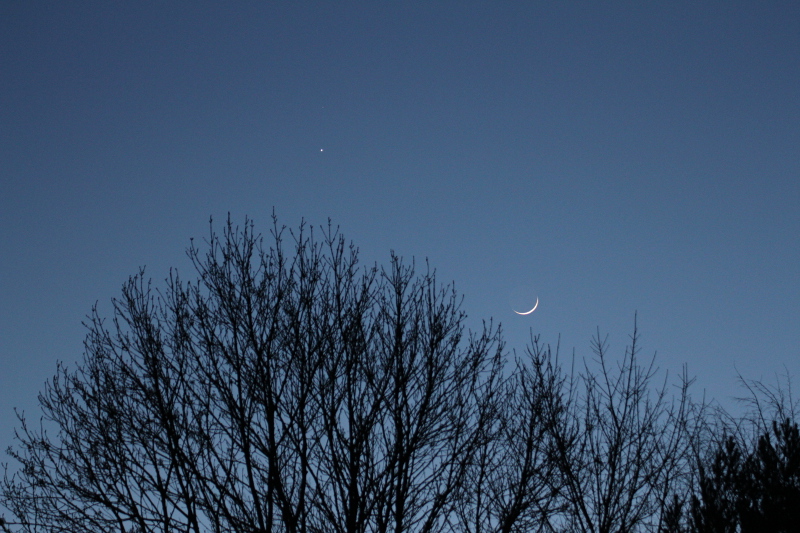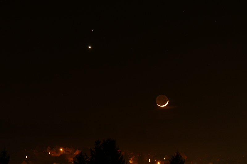 Am Abend des 20. Februar standen unsere Nachbarplaneten Venus und Mars (oben) tief am Westhorizont nahe beieinander. Zu ihnen gesellte sich die extrem dünne Sichel des erst einen Tag alten Mondes.