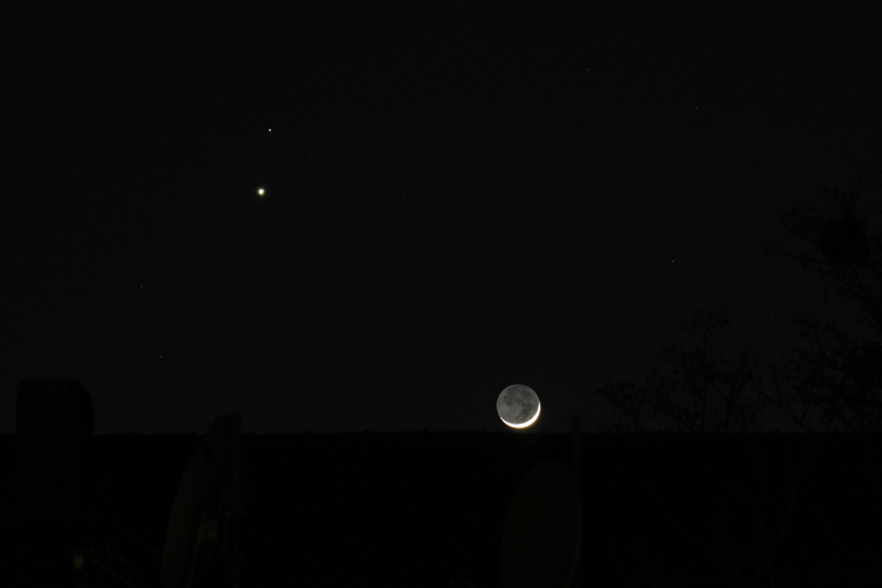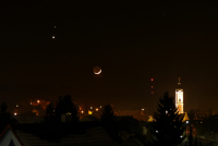 Venus ist bei den ersten drei Bildern links oben zu sehen. Die sehr schmale zunehmende Mondsichel ist etwas rechts unterhalb der Mitte zu finden. Auf dem letzten Bild steht der schon teilweise untergegangene Mond in der Bildmitte.