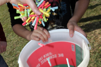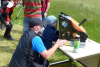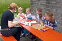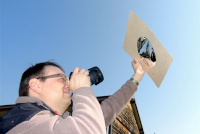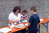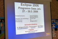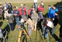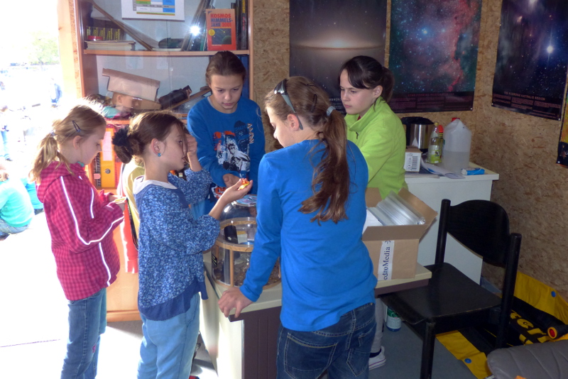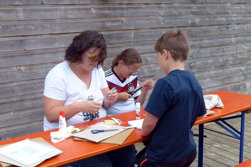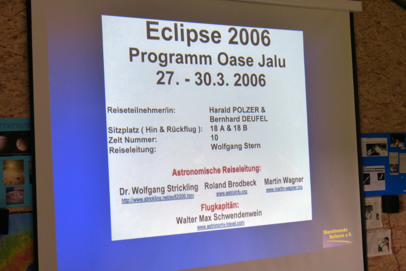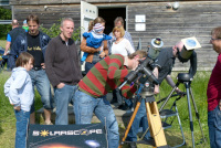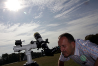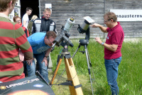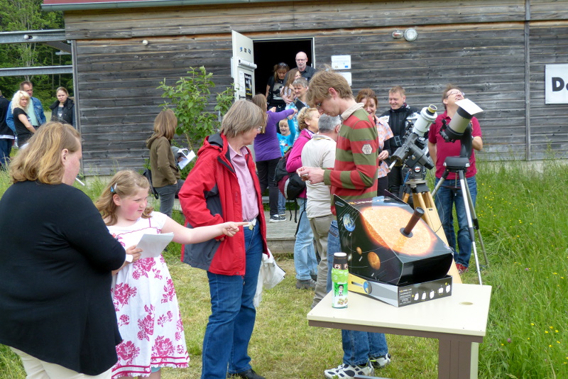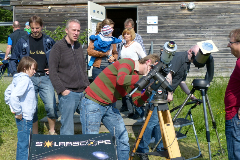 Leider gab es anfangs nur wenige Wolkenlücken und man musste auf der Wiese vor der Sternwarte schnell von Teleskop zu Teleskop springen um einen Blick auf die Sonne im weißen oder im roten Ha-Licht zu erhaschen. Um die Wartezeit zu verkürzen gab es im Vortragsraum der Sternwarte einen kurzweiligen und reich bebilderten Bericht von Harry Polzer über seine Reise zur totalen Sonnenfinsternis am 29. März 2006 in Libyen. Sternfreund Ben Mirwald unterstützte währenddessen viele Kinder und Eltern beim Bau von Sonnenuhren und deren praktischer Anwendung.