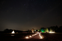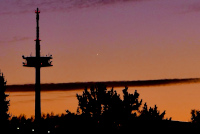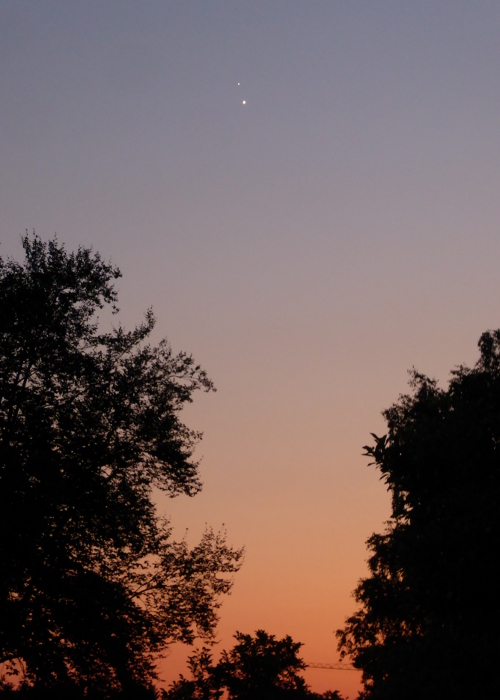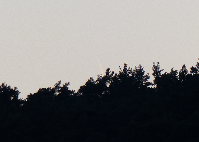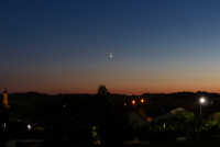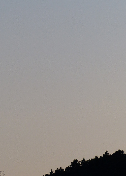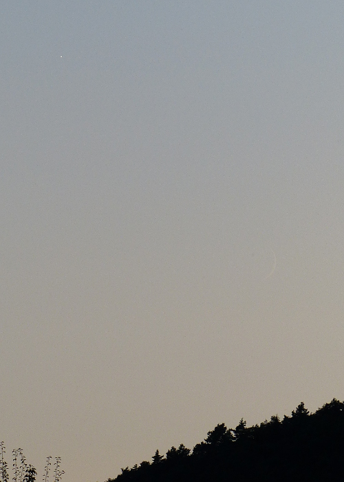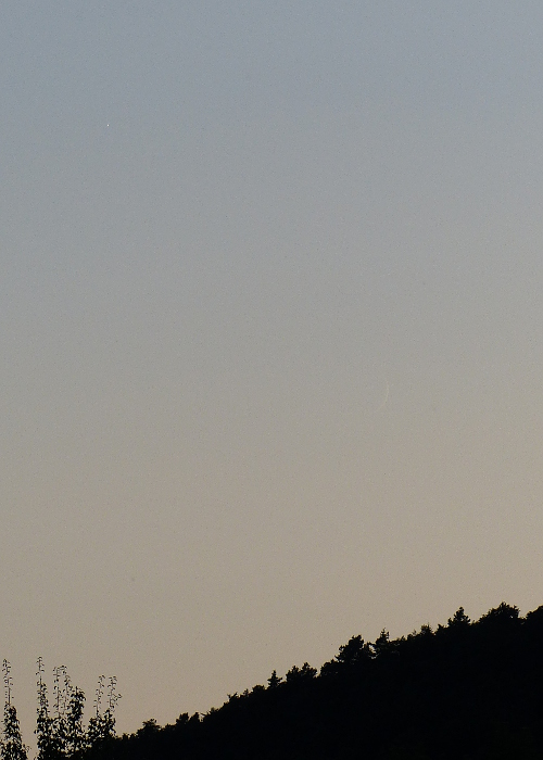 Am Samstag, den 18. Juli, hat Sternfreund Harry Polzer während der Sternführung über dem eisenzeitlichen Gehöft in Oberhofen bei Riedenburg kurz nach Sonnenuntergang den "Abendstern" Venus und die erst zwei Tage alte zunehmende schmale Mondsichel eingefangen.