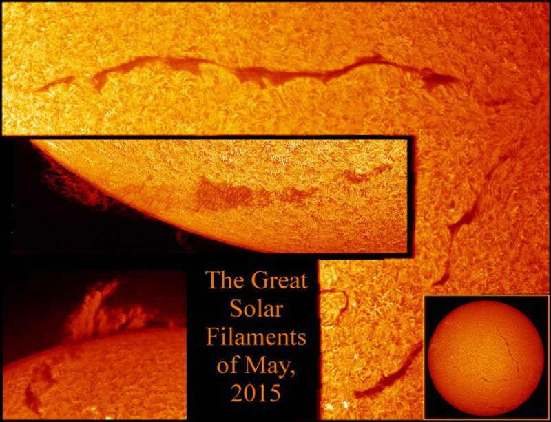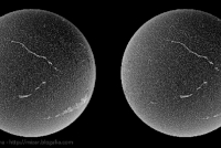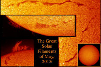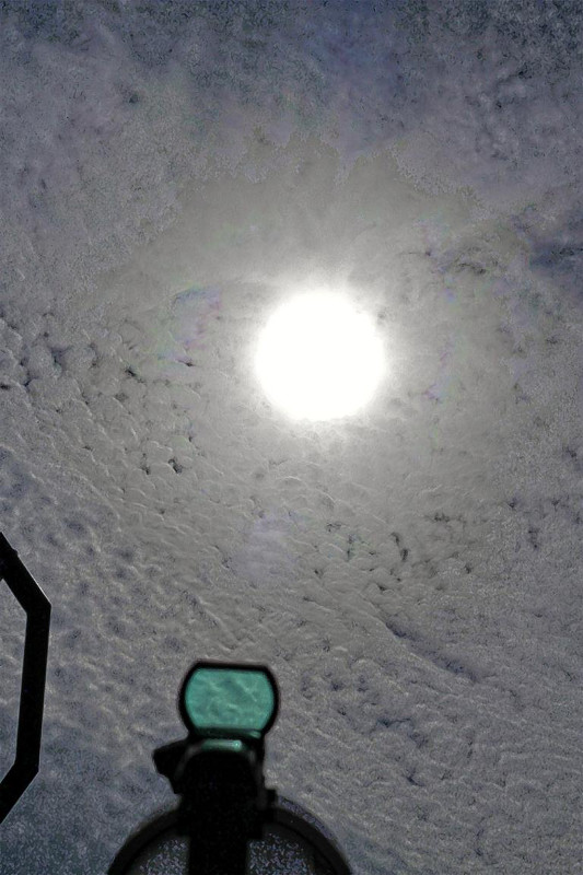 Gegen 16 Uhr riss die Wolkendecke plötzlich auf und gab den Blick auf eine aktive Sonne mit vielen Protuberanzen und einem riesigen Filament (siehe Bilder 23+24) auf der Sonnenoberfläche frei. Gegen 17 Uhr beendete eine aufziehende neue Wolkenfront einen ereignisreichen Beobachtungsnachmittag.